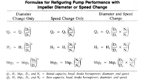 The Affinity Law states that for similar conditions of flow (i.e. substantially same efficiency) the capacity (Q) will vary directly with the ratio of speed (N2/N1) and/or impeller diameter (D2/D1) and the head with the square of this ratio at the point of best efficiency (BEP). Other points to the left or right of the best efficiency point will correspond similarly. Refer table to view the relation between capacity (Q), speed (N), impeller size (D), pump head (H) and motor power (bhp).